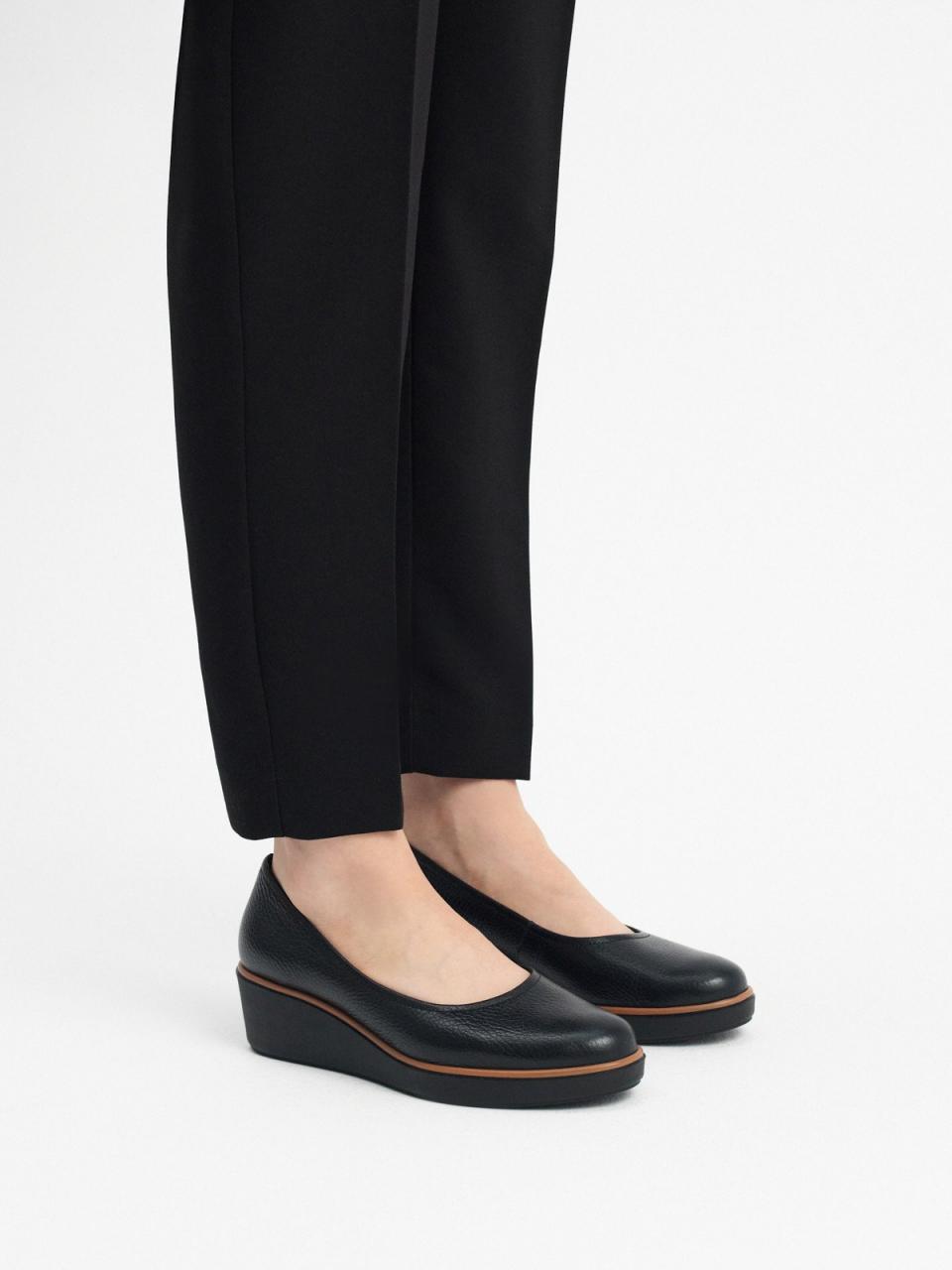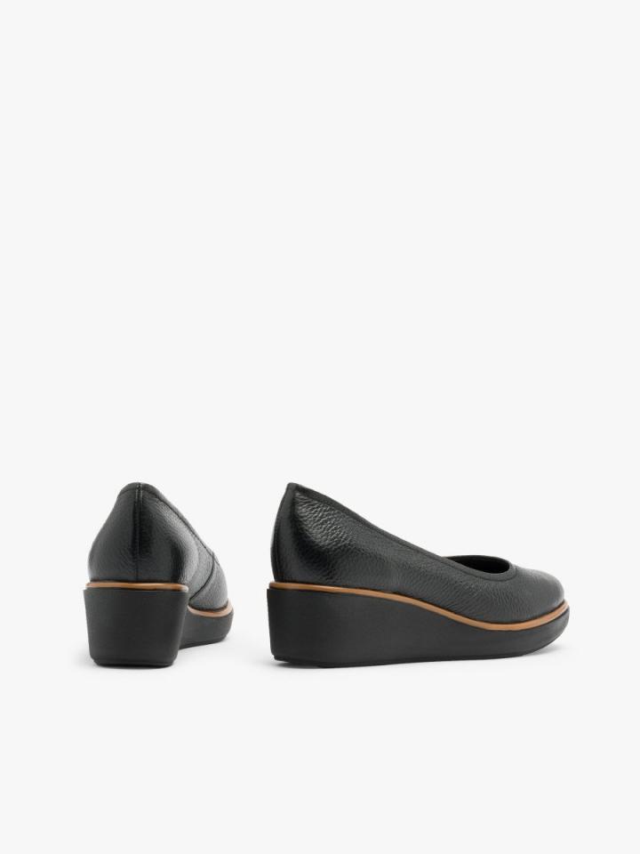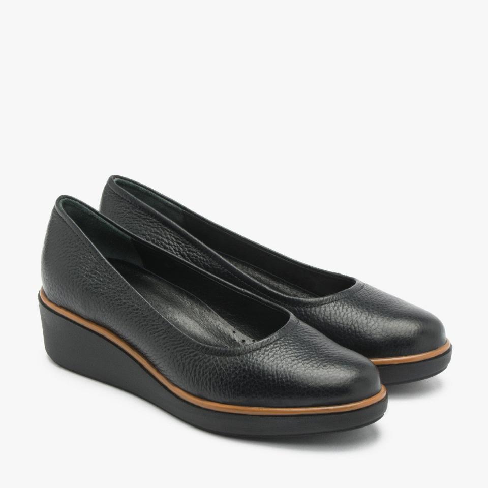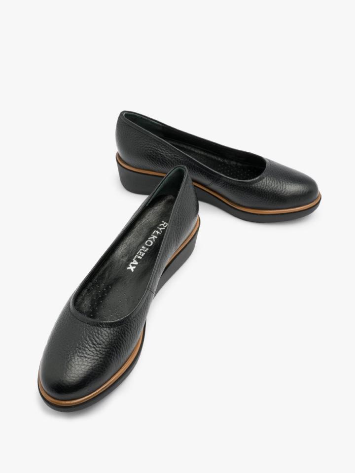 Czarne czółenko z linii RYŁKO RELAX. Model wykonany ze skóry licowej. Podszewka i wyściółka skórzana. Klin + platforma o wysokości 5 cm. Nosek okrągły. W tym modelu obuwia pod wyściółką znajduje się pianka amortyzująca z węglem aktywnym. Nadaje to jej właściwości silnie antybakteryjne i przeciwgrzybicze. Pianka zapewnia cyrkulację powietrza oraz pochłania nadmiar wilgoci. Pianka jest miękka – doskonale amortyzuje i dopasowuje się do stopy, zapewniając jej dodatkowe podparcie. Właściwości te znacząco podnoszą komfort i wygodę użytkowania obuwia. Dystrybutor: Brawo Sp. z o.o. ul. Dworcowa 19, 34-130 Kalwaria Zebrzydowska;