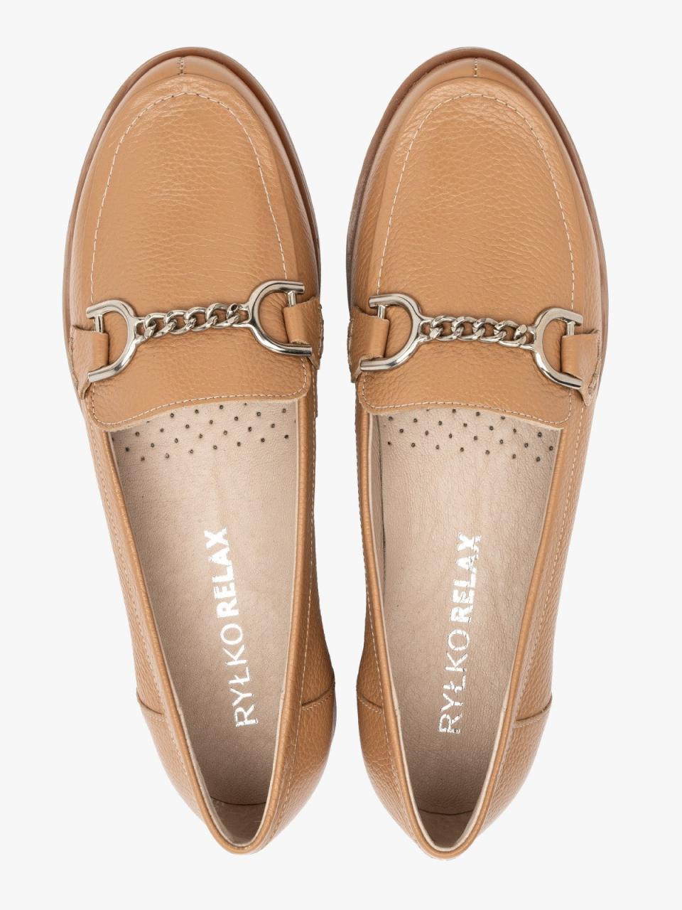 Beżowe mokasyny ze srebrną ozdobą na cholewce z linii RYŁKO RELAX. Model wykonany ze skóry licowej. Podszewka i wyściółka skórzana. Podeszwa płaska. Nosek okrągły. W tym modelu obuwia pod wyściółką znajduje się pianka amortyzująca z węglem aktywnym. Nadaje to jej właściwości silnie antybakteryjne i przeciwgrzybicze. Pianka jest perforowana, dzięki czemu zapewnia cyrkulację powietrza oraz pochłania nadmiar wilgoci. Pianka jest miękka i dopasowuje się do stopy. Właściwości te znacząco podnoszą komfort użytkowania obuwia. Dystrybutor: Brawo Sp. z o.o. ul. Dworcowa 19, 34-130 Kalwaria Zebrzydowska;