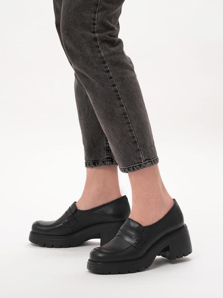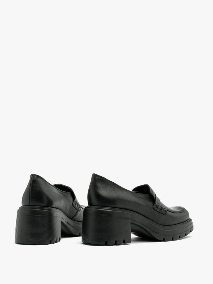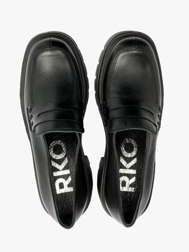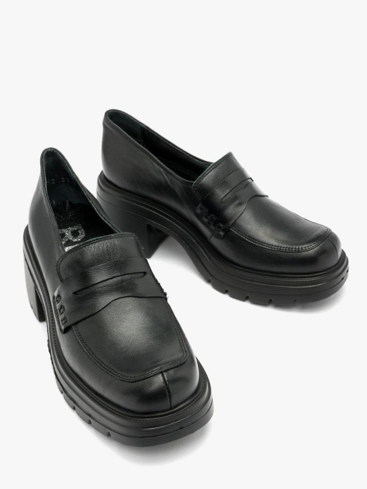 Czarny mokasyn na obcasie z linii RKO. Model wykonany ze skóry licowej. Podszewka i wyściółka skórzana. Obcas o wysokości 7 cm. Nosek kwadratowy. R.FLY – Niezwykle lekka i sprężysta podeszwa wykonana z materiału EVA. Zapewnia wysoki komfort użytkowania. Nieporowata, łatwa do czyszczenia wilgotną szmatką. W tym modelu obuwia pod wyściółką znajduje się pianka amortyzująca z węglem aktywnym. Nadaje to jej właściwości silnie antybakteryjne i przeciwgrzybicze. Pianka jest perforowana, dzięki czemu zapewnia cyrkulację powietrza oraz pochłania nadmiar wilgoci. Pianka jest miękka i dopasowuje się do stopy. Właściwości te znacząco podnoszą komfort użytkowania obuwia. Dystrybutor: Brawo Sp. z o.o. ul. Dworcowa 19, 34-130 Kalwaria Zebrzydowska;