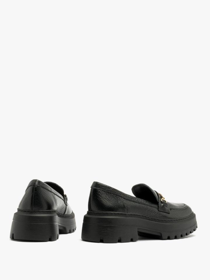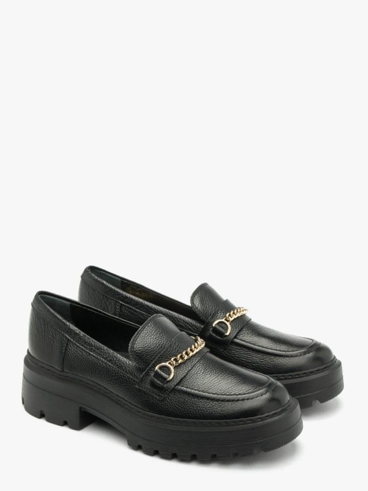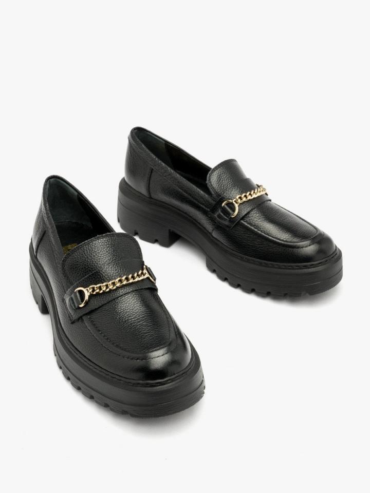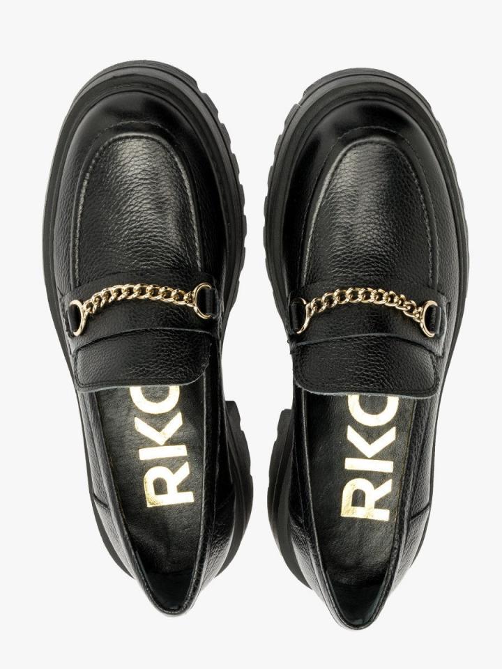 Czarne mokasyny ze złotym łańcuszkiem z linii RKO. Model wykonany ze skóry licowej. Podszewka i wyściółka skórzana. Podeszwa płaska o grubości 5 cm. Nosek okrągły. R.FLY – Niezwykle lekka i sprężysta podeszwa wykonana z materiału EVA. Zapewnia wysoki komfort użytkowania. Nieporowata, łatwa do czyszczenia wilgotną szmatką. W tym modelu obuwia pod wyściółką znajduje się pianka amortyzująca z węglem aktywnym. Nadaje to jej właściwości silnie antybakteryjne i przeciwgrzybicze. Pianka jest perforowana, dzięki czemu zapewnia cyrkulację powietrza oraz pochłania nadmiar wilgoci. Pianka jest miękka i dopasowuje się do stopy. Właściwości te znacząco podnoszą komfort użytkowania obuwia. Dystrybutor: Brawo Sp. z o.o. ul. Dworcowa 19, 34-130 Kalwaria Zebrzydowska;