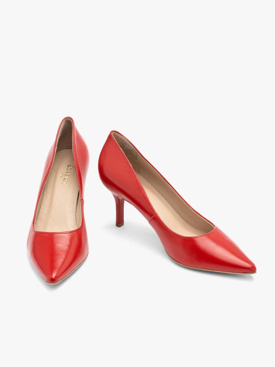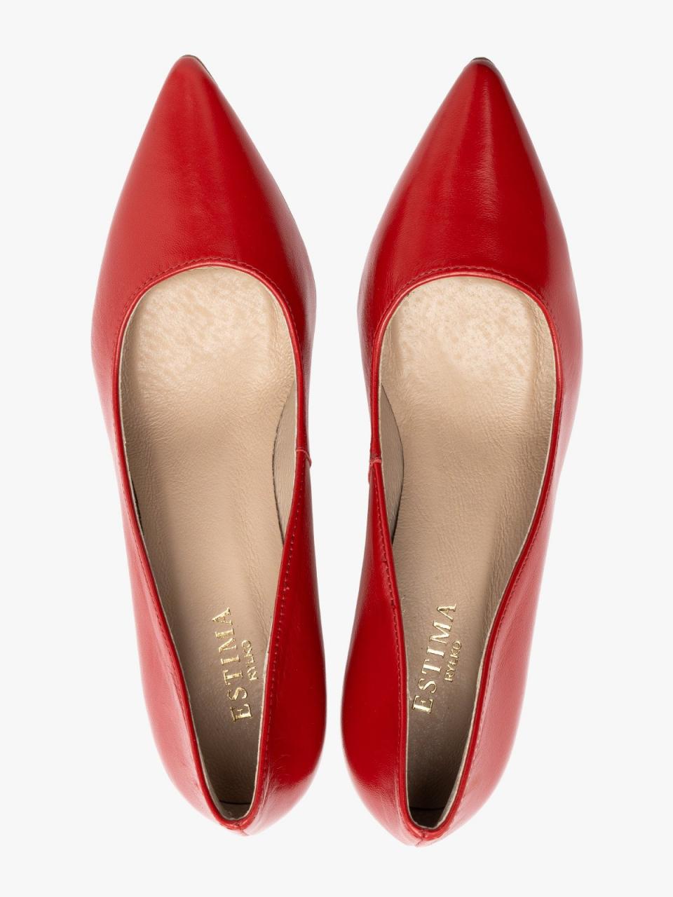 Czerwone czółenka na szpilce z linii ESTIMA. Model wykonany z najwyższej jakości skóry licowej. Podszewka i wyściółka skórzana. Szpilka oblekana o wysokości 7,5 cm. Nosek w szpic. Wysokość obcasa uśredniona dla rozmiaru 37. Dystrybutor: Brawo Sp. z o.o. ul. Dworcowa 19, 34-130 Kalwaria Zebrzydowska;